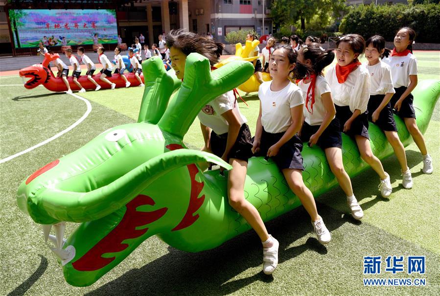 6月24日,西安市新城區(qū)后宰門(mén)小學(xué)的學(xué)生在進(jìn)行旱地龍舟比賽。端午節(jié)臨近,各地舉行包粽子、做香包、賽龍舟等豐富多彩的民俗文化活動(dòng),迎接傳統(tǒng)佳節(jié)的到來(lái)。新華社記者劉瀟攝