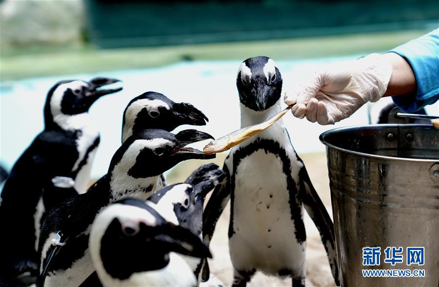 6月26日,漫步歸來的企鵝得到美食獎賞。新華社記者 張建松 攝
