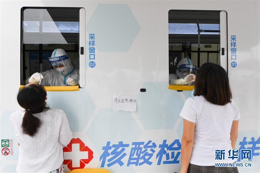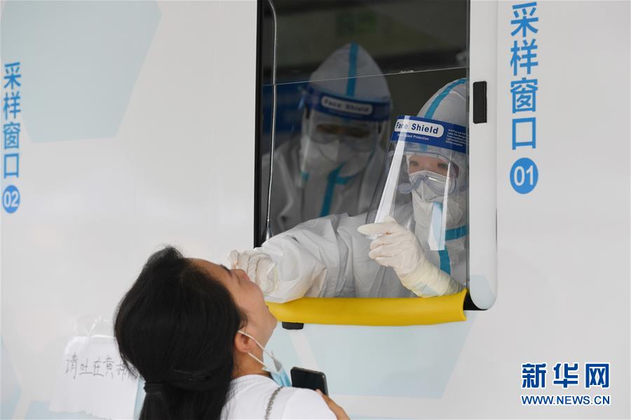 6月28日,在北京市西城區(qū)北京展覽館南側(cè)的露天廣場核酸檢測采樣點,前來做檢測的人員在核酸檢測采樣車旁進(jìn)行采樣。新華社記者鞠煥宗攝