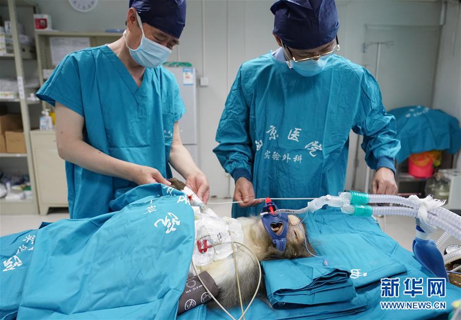 6月29日,研究人員在病房內(nèi)查看移植肝受體猴。日前,多基因編輯豬-恒河猴異種肝、心、腎器官移植在位于陜西西安的空軍軍醫(yī)大學(xué)西京醫(yī)院順利實施。研究團(tuán)隊使用豬內(nèi)源性逆轉(zhuǎn)錄病毒(PERV)敲除的13個基因修飾豬作為供體,將一個供體豬的肝、心、腎分別移植給3只恒河猴受體。目前,移植肝和對應(yīng)的受體猴已存活16天,突破國際上的豬-猴輔助性肝移植最長存活時間記錄。這項研究有助于未來解決器官短缺造成的臨床器官移植發(fā)展受限難題。新華社記者邵瑞攝