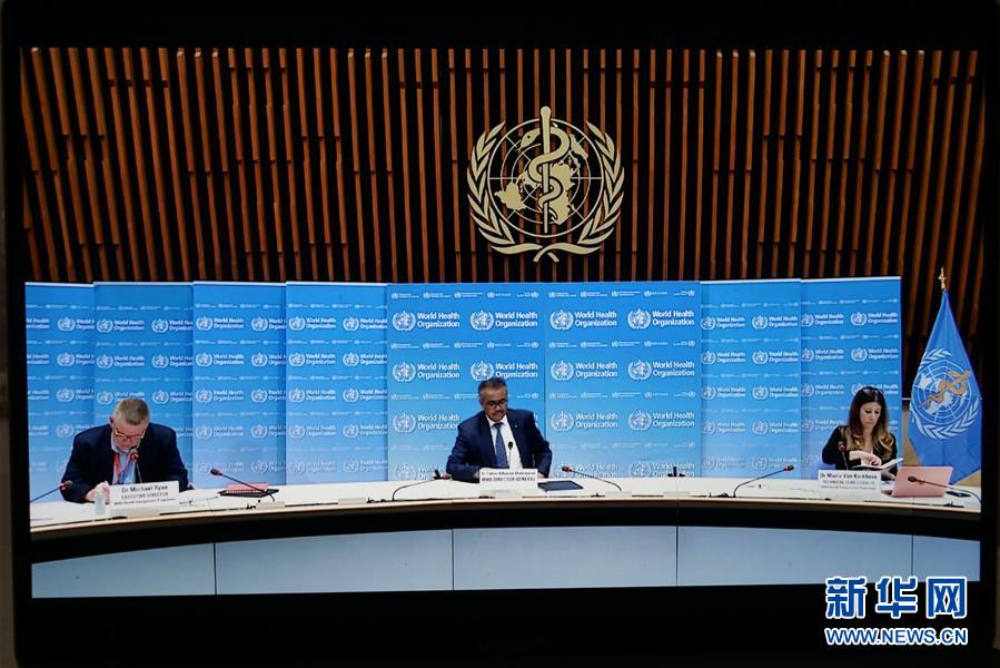 這是6月29日在比利時布魯塞爾拍攝的世界衛(wèi)生組織總干事譚德塞(中)在瑞士日內(nèi)瓦出席線上記者會。新華社記者張鋮攝