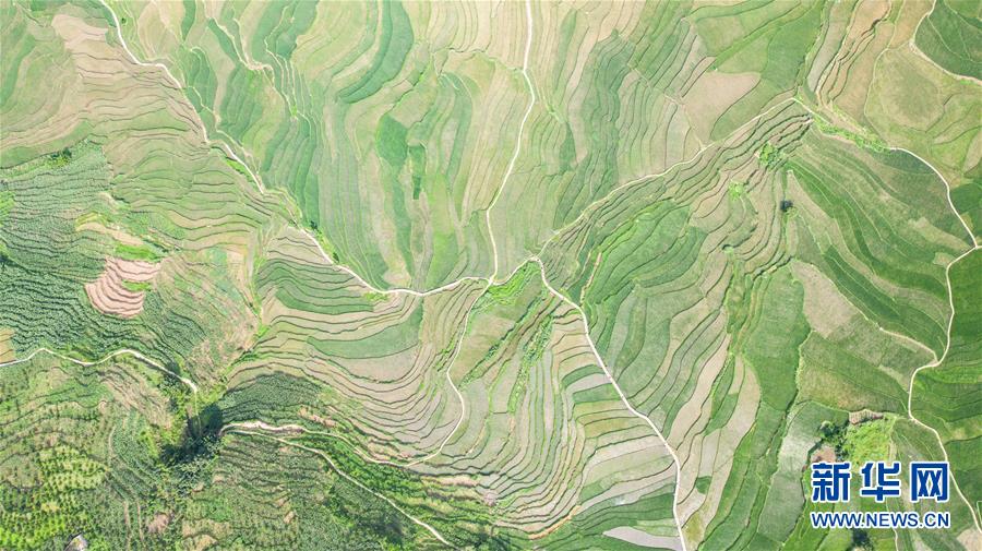 貴州省盤州市新民鎮(zhèn)的梯田風光(6月29日攝,無人機照片)。夏日時節(jié),貴州省盤州市新民鎮(zhèn)的梯田風景如畫。新華社記者陶亮攝