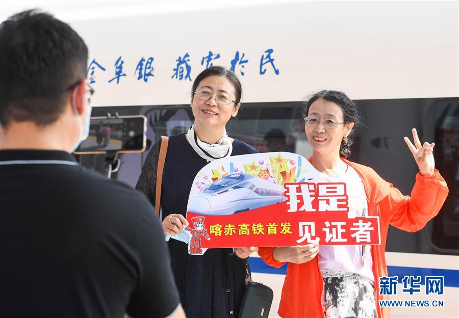 6月30日,乘客在赤峰站與G8382次“和諧號(hào)”動(dòng)車組列車合影留念。新華社記者彭源攝