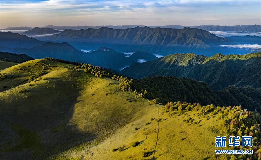 6月30日,朝霞照耀下的神田草甸(無人機(jī)照片)。位于陜西省安康市嵐皋縣與重慶市城口縣交界處大巴山神田主脊北坡的神田草甸,面積超過1.1萬畝。夏日的朝霞中,起伏的草甸仿佛一塊寬大無邊的綠色地毯,鑲嵌在大巴山上,如詩如畫。新華社記者陶明攝