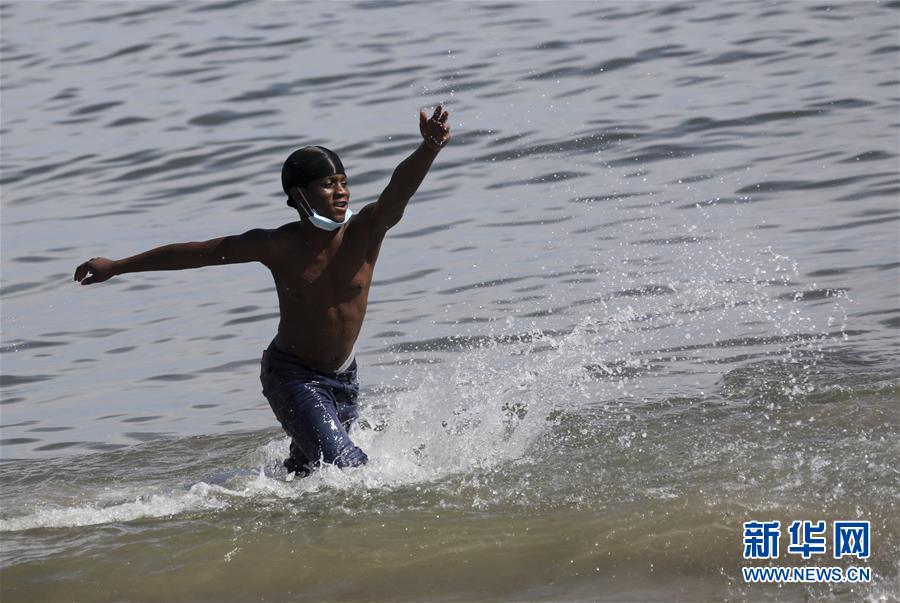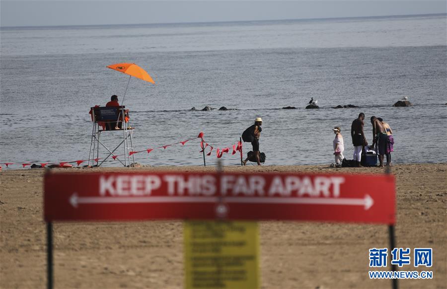 7月1日,人們?cè)诿绹?guó)紐約科尼島戲水。當(dāng)日,美國(guó)紐約市屬八處海灘正式重新準(zhǔn)許民眾游泳,救生員也同時(shí)上崗。新華社記者王迎攝