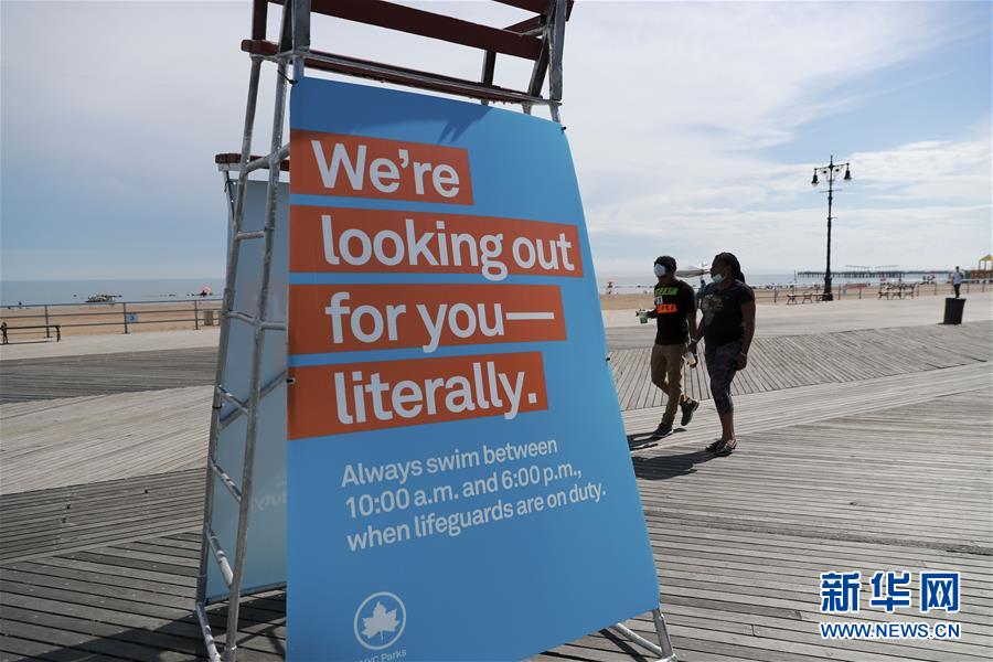 這是7月1日在美國(guó)紐約科尼島一處海灘上拍攝的關(guān)于允許游泳時(shí)間的提示牌。當(dāng)日,美國(guó)紐約市屬八處海灘正式重新準(zhǔn)許民眾游泳,救生員也同時(shí)上崗。新華社記者王迎攝