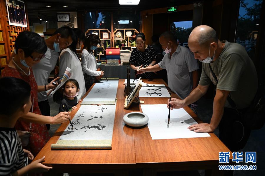 游客在洛陽市洛邑古城的汝陽劉毛筆店內(nèi)參觀體驗(yàn)(6月29日攝)。新華社記者 張浩然 攝