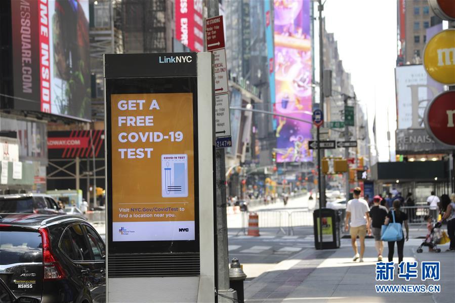 這是7月4日在美國紐約時報廣場附近拍攝的顯示新冠檢測信息的顯示屏。當日是美國獨立日,美國多地疫情仍面臨嚴峻形勢。美國約翰斯·霍普金斯大學實時統(tǒng)計數(shù)據(jù)顯示,美國累計新冠確診病例4日已超過280萬例。新華社記者王迎攝