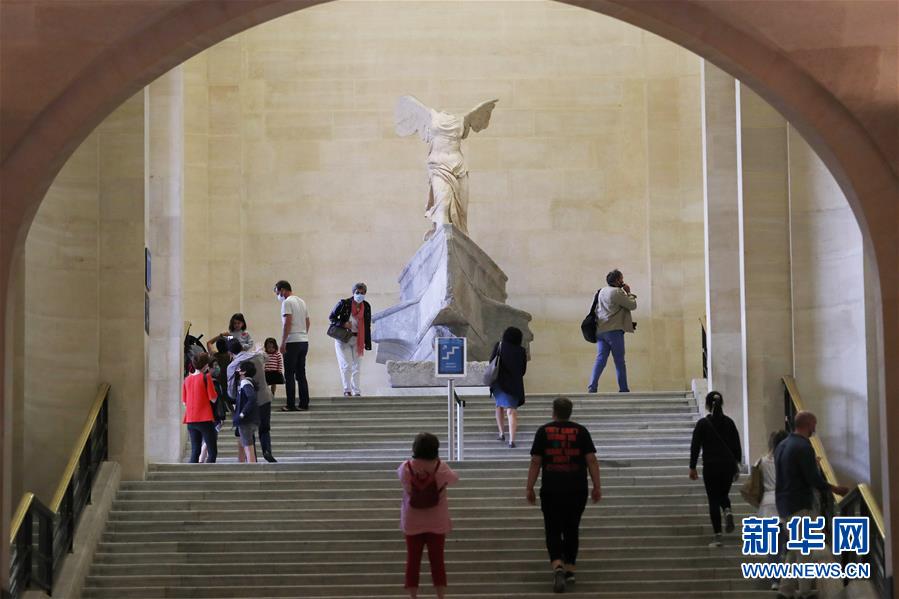 7月6日,在法國巴黎盧浮宮博物館,人們參觀雕塑《薩莫色雷斯勝利女神》。因新冠病毒疫情關(guān)閉3個(gè)多月后,法國盧浮宮博物館于6日重新開放。新華社記者高靜攝