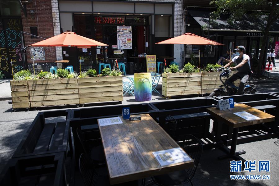 7月6日,一名男子騎車從美國紐約一家餐廳的戶外餐區(qū)旁經(jīng)過。當(dāng)天,紐約進(jìn)入重啟第三階段,美甲店、按摩店等個人護(hù)理業(yè)在經(jīng)歷近4個月的停業(yè)后被允許重新開放。因防疫需要,原本應(yīng)在第三階段開放的餐飲業(yè)室內(nèi)就餐仍處于暫停狀態(tài)。新華社記者王迎攝