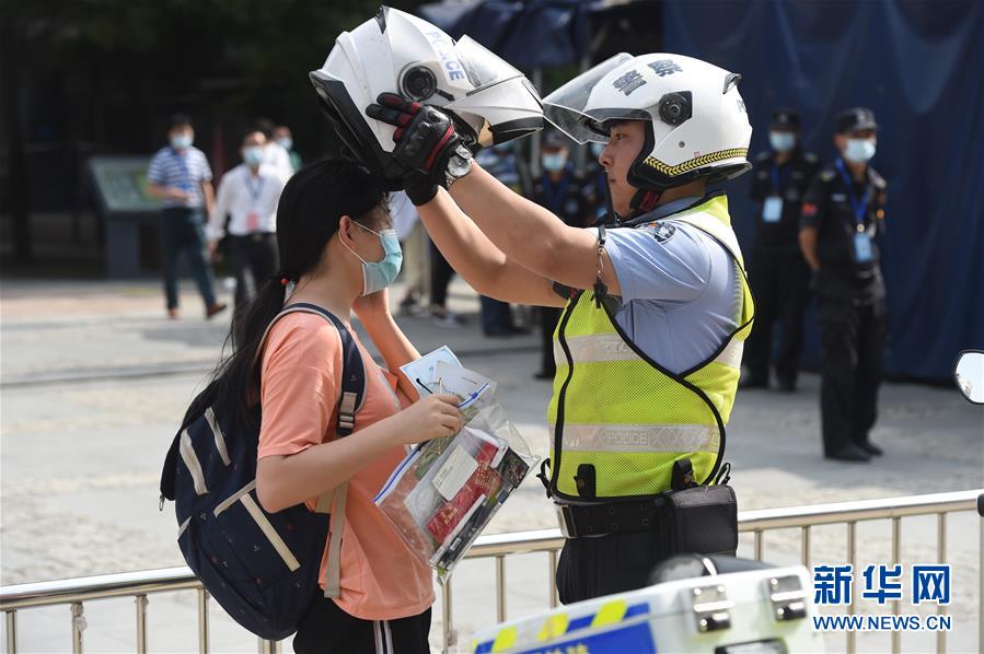 7月7日,在安徽省合肥市五十中學(xué)天鵝湖校區(qū)考點,交警將快要遲到的考生送到考場。當(dāng)日,2020年高考拉開帷幕。新華社記者周牧攝