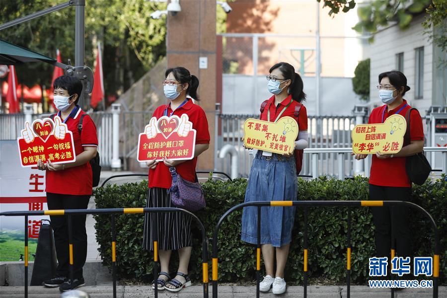7月7日,在位于北京的中國人民大學(xué)附屬中學(xué)考點外,前來送考的老師舉著提示牌送考生進(jìn)考場。當(dāng)日,2020年高考拉開帷幕。新華社記者沈伯韓攝