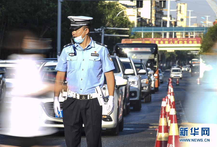 7月7日,在烏魯木齊市第六十八中學(xué)考點(diǎn)外,烏魯木齊市公安局交通警察支隊(duì)新市區(qū)大隊(duì)阿勒泰路中隊(duì)中隊(duì)長謝建明在引導(dǎo)考生通過馬路。當(dāng)日,2020年高考拉開帷幕。新華社記者王菲攝