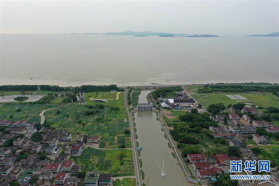 7月7日無人機(jī)拍攝的吳興高新區(qū)幻溇村連通太湖的水閘。太湖水位近期持續(xù)上漲。近日,位于浙江北部的湖州市遭遇多輪降雨,東部平原河網(wǎng)普遍超警戒水位,水庫山塘高位運(yùn)行。7月5日12時30分,湖州市人民政府防汛防旱指揮部將防汛應(yīng)急響應(yīng)提升至Ⅲ級,要求各地密切監(jiān)測汛情,切實做好各項防范工作,確保安全度汛。新華社記者黃宗治攝