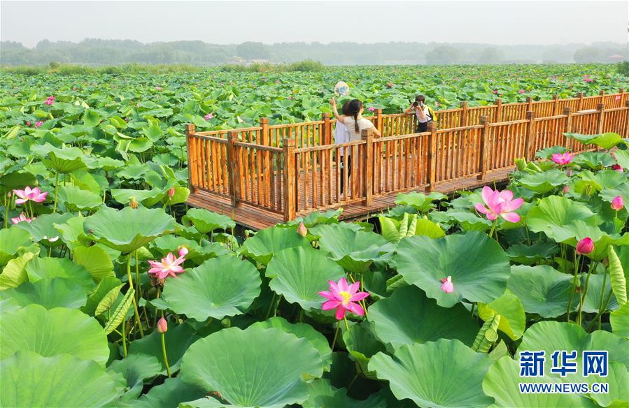7月7日,游客在唐山市南湖公園內(nèi)的觀荷棧橋上拍照。近日,河北省唐山市南湖公園內(nèi)荷花競(jìng)相綻放,呈現(xiàn)出“接天蓮葉無(wú)窮碧,映日荷花別樣紅”的美麗景象,吸引了眾多游客前來(lái)觀賞。新華社記者楊世堯攝