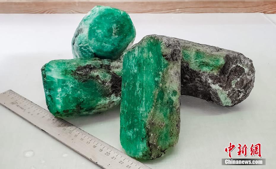當(dāng)?shù)貢r間7月7日,俄羅斯斯維爾德洛夫斯克州,俄羅斯國家技術(shù)集團(tuán)在馬林斯克礦區(qū)內(nèi)發(fā)現(xiàn)總重量達(dá)4.8公斤的4塊綠寶石,是最近20年來發(fā)現(xiàn)的同類品質(zhì)中最大的寶石。圖片來源:視覺中國