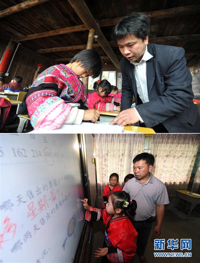 這是一張拼版照片,上圖:在廣西龍勝龍脊鎮(zhèn)江柳村翁江小學(xué),余啟貴老師在課間輔導(dǎo)學(xué)生功課(2013年2月26日攝);下圖:在廣西龍勝龍脊鎮(zhèn)江柳村翁江小學(xué),余啟貴老師在課間輔導(dǎo)學(xué)生功課(7月7日攝)。新華社記者陸波岸攝