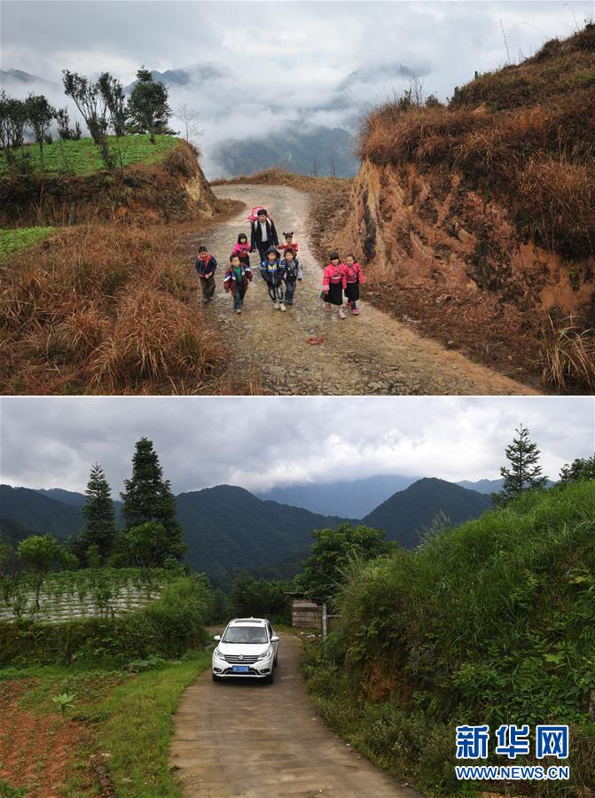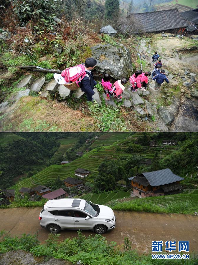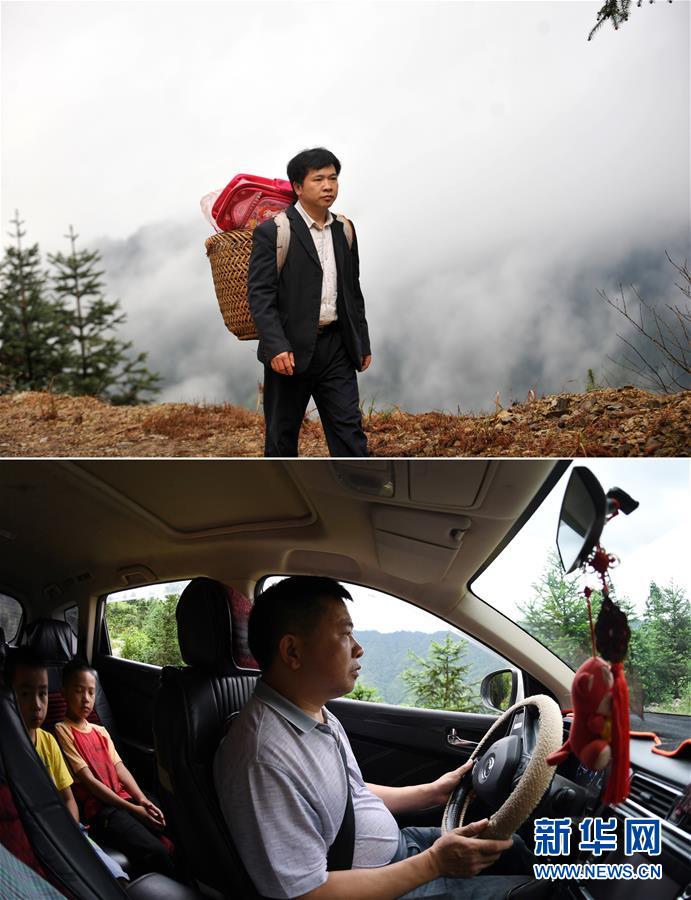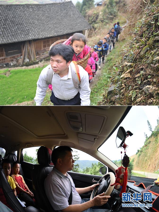 這是一張拼版照片,上圖:在廣西龍勝龍脊鎮(zhèn)江柳村,余啟貴老師背著背簍領(lǐng)著學(xué)生去學(xué)校(2013年2月26日攝);下圖:在廣西龍勝龍脊鎮(zhèn)江柳村,余啟貴老師開(kāi)著自己的汽車帶著學(xué)生去學(xué)校(7月7日攝)。新華社記者陸波岸攝
