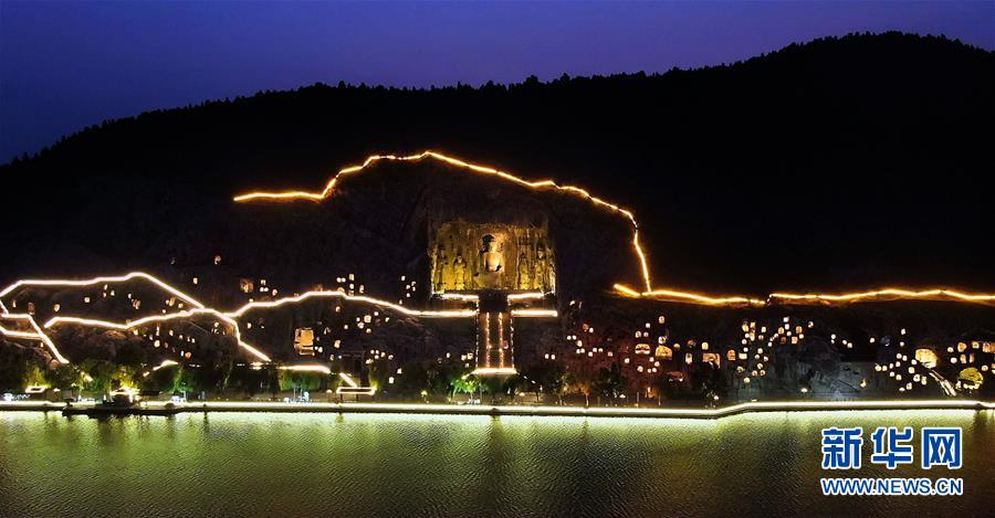 7月7日拍攝的洛陽龍門石窟景區(qū)夜景(無人機照片)。近日,河南洛陽的夜晚愈發(fā)繽紛多彩。立足于厚重的隋唐文化底蘊,洛陽正通過創(chuàng)新夜游產(chǎn)品打響“古都夜八點”品牌,激活文旅消費。新華社記者李安攝