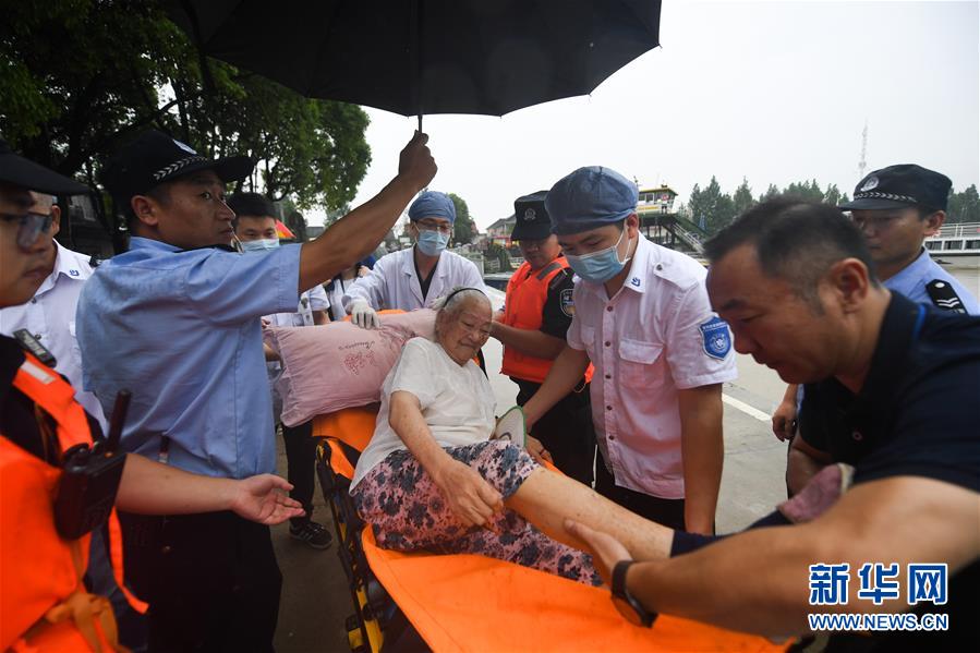 7月8日,應(yīng)急人員將東洲街道五豐島97歲癱瘓?jiān)诖驳亩咸冯x出來,安全轉(zhuǎn)移到岸上。新華社記者徐昱攝