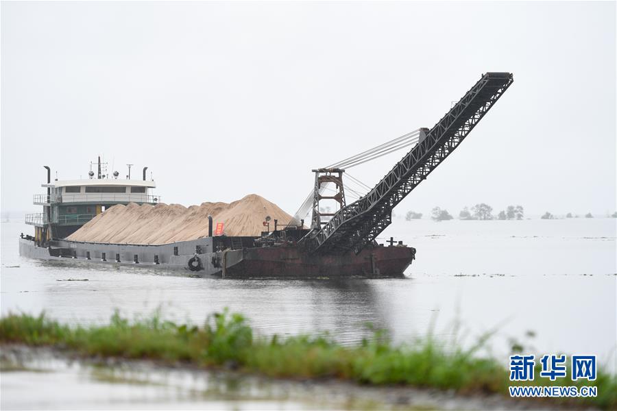 在益陽市大通湖區(qū)東大堤附近水域,一艘船采取“以船代倉”方式儲(chǔ)備防汛物資(7月8日攝)。新華社記者陳澤國攝