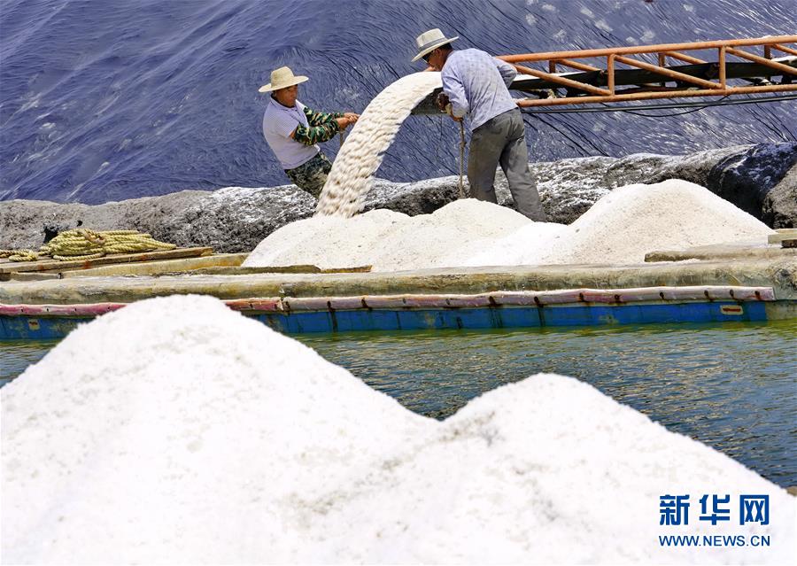 7月9日,唐山市曹妃甸區(qū)南堡鹽場的工人將收獲的春鹽裝船。在我國長蘆鹽區(qū)海鹽生產(chǎn)基地之一的河北省唐山市曹妃甸區(qū)南堡鹽場,一年一度的春鹽收獲工作即將結(jié)束,今年南堡鹽場的春鹽產(chǎn)量預(yù)計可達(dá)72萬噸。新華社記者楊世堯攝