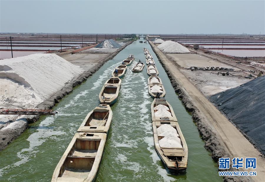 7月9日,唐山市曹妃甸區(qū)南堡鹽場(chǎng)的運(yùn)鹽船只在運(yùn)輸河道內(nèi)行駛(無人機(jī)照片)。在我國長(zhǎng)蘆鹽區(qū)海鹽生產(chǎn)基地之一的河北省唐山市曹妃甸區(qū)南堡鹽場(chǎng),一年一度的春鹽收獲工作即將結(jié)束,今年南堡鹽場(chǎng)的春鹽產(chǎn)量預(yù)計(jì)可達(dá)72萬噸。新華社記者楊世堯攝