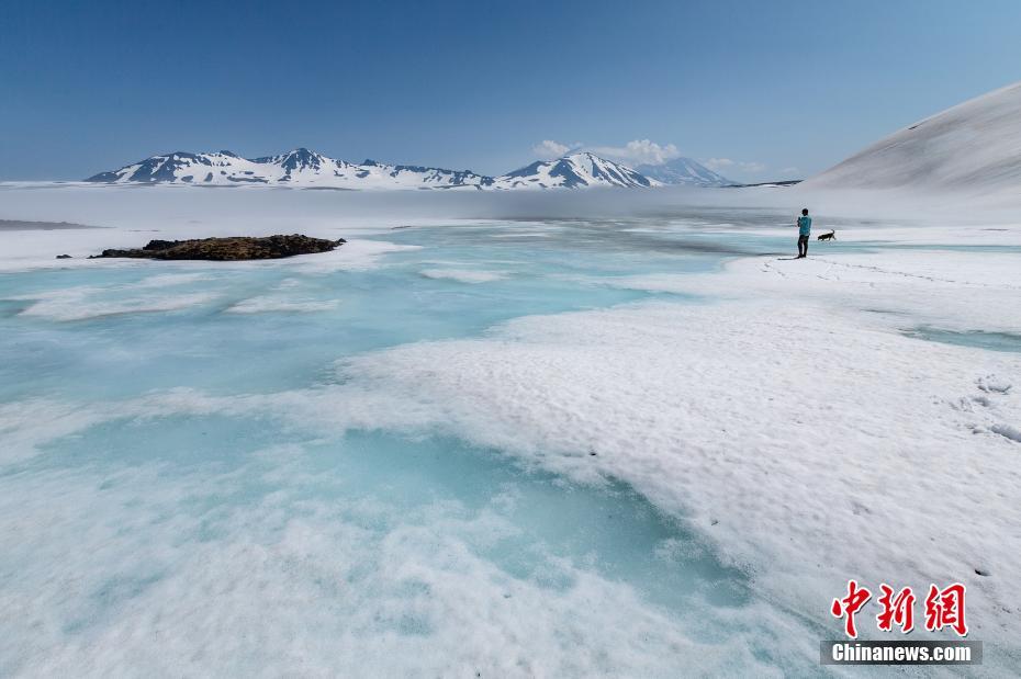 俄羅斯“冰封”火山一片純白 融雪形成火山湖