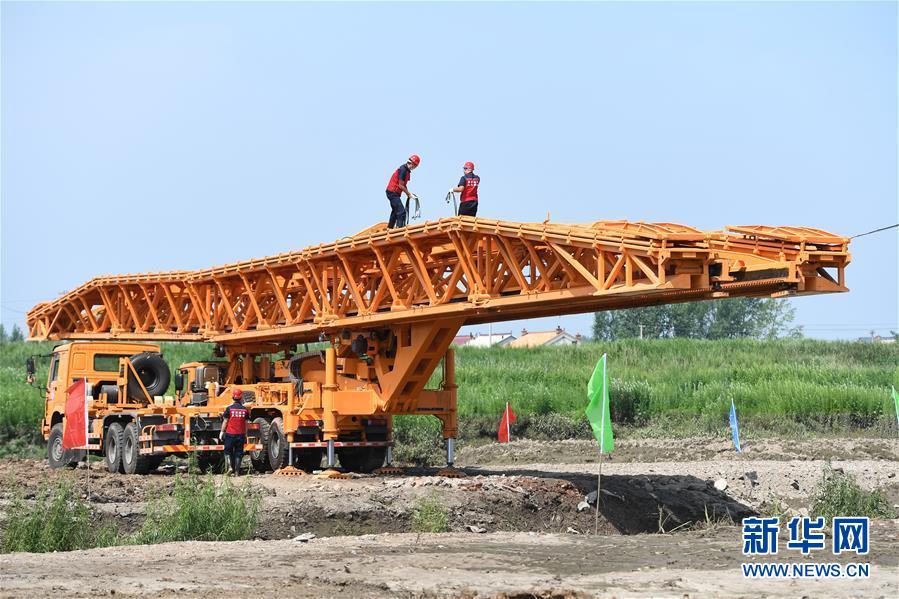 7月10日,工作人員在演練現(xiàn)場(chǎng)搭建機(jī)械化橋梁。當(dāng)日,由吉林省交通運(yùn)輸廳主辦的公路橋梁水毀搶通應(yīng)急演練在長(zhǎng)春市雙陽區(qū)雙陽河舉行,參與演練人員從汛情水毀信息報(bào)送、應(yīng)急裝備快速集結(jié)、機(jī)械化橋梁搶通搭設(shè)、善后處理等方面進(jìn)行實(shí)戰(zhàn)演練。新華社記者張楠攝