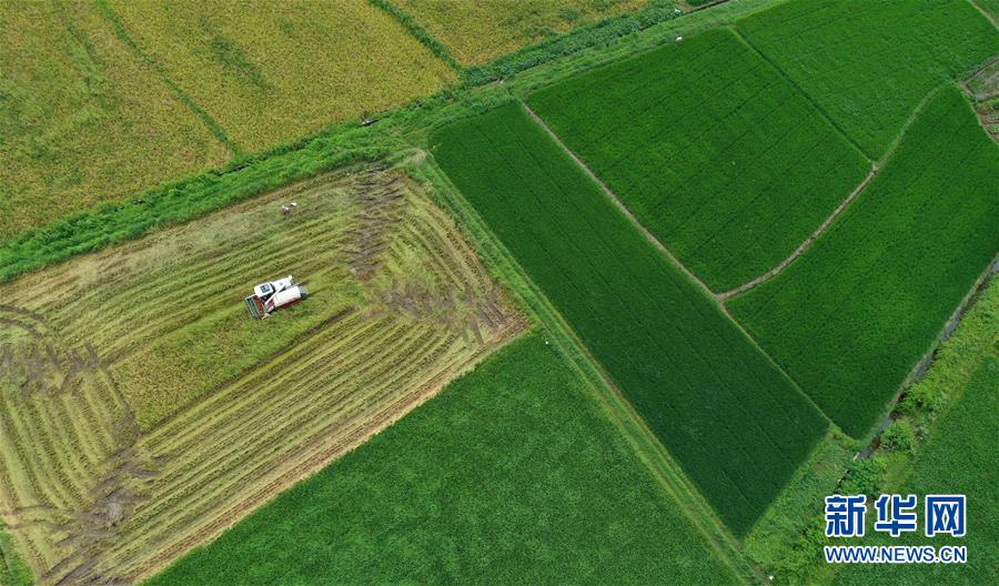7月11日,在湖南省衡陽市衡陽縣臺(tái)源鎮(zhèn)臺(tái)九村,村民駕駛收割機(jī)收割早稻(無人機(jī)照片)。近日,湖南各地農(nóng)村陸續(xù)進(jìn)入“雙搶”季,農(nóng)民緊抓農(nóng)時(shí),搶收搶種,力爭(zhēng)糧食穩(wěn)產(chǎn)豐收。新華社記者趙眾志攝