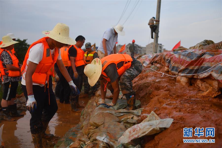 在江西鄱陽縣昌江圩,武警江西總隊(duì)機(jī)動(dòng)支隊(duì)的工作人員和當(dāng)?shù)卮迕褚黄鸺庸疼椎蹋?月12日攝)。新華社記者 胡晨歡 攝