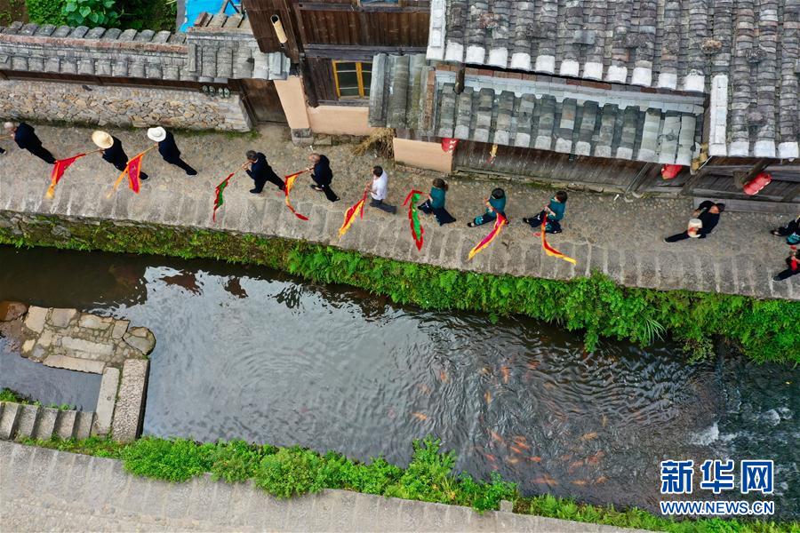 7月4日,浦源村民展示魚祭習俗(無人機照片)。魚祭習俗是為死去的鯉魚舉行送葬儀式,是浦源村特有的習俗。新華社記者 姜克紅 攝