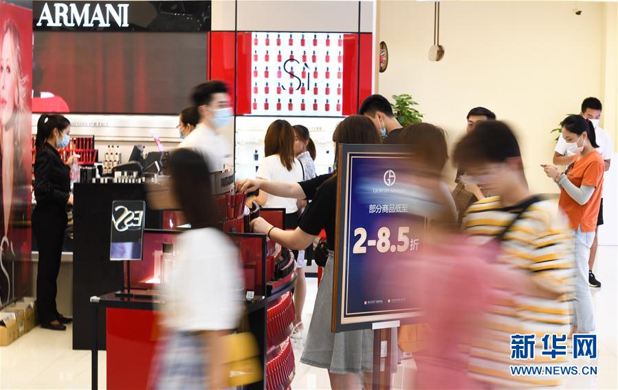 7月12日,游客在??谌赵聫V場免稅店選購化妝品。新華社記者 楊冠宇 攝