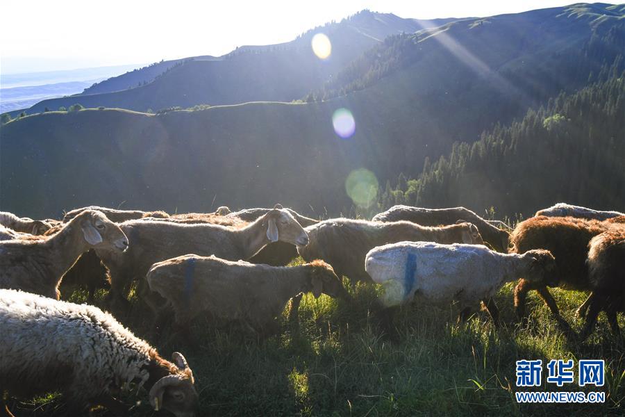 在新疆伊犁特克斯縣境內(nèi)的夏牧場(chǎng)里,羊群在吃草(7月2日攝)。新華社記者 王菲 攝