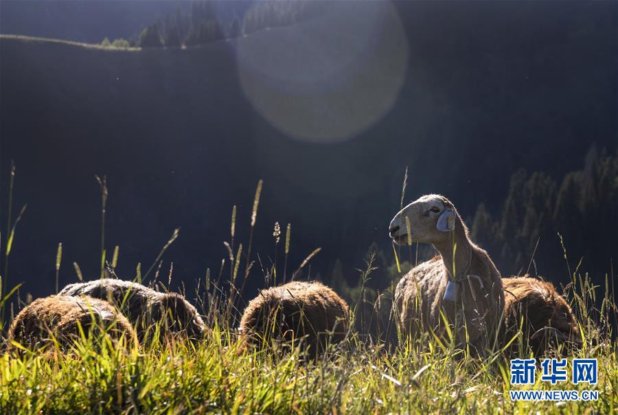 在新疆伊犁特克斯縣境內(nèi)的夏牧場(chǎng)里,羊群在吃草(7月2日攝)。新華社記者 王菲 攝