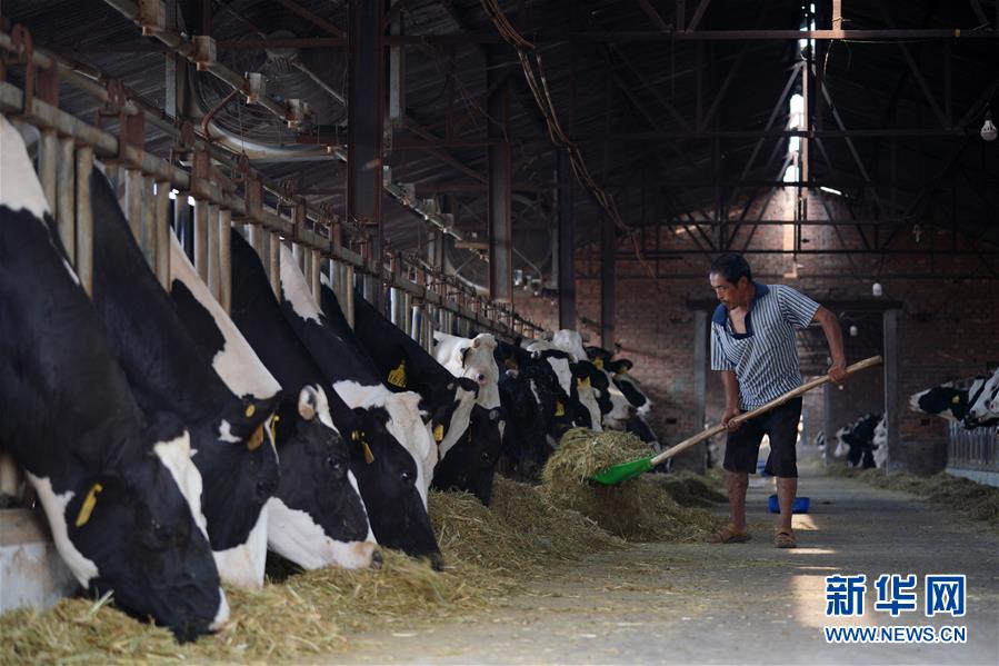 7月11日,河北省清河縣永興奶牛養(yǎng)殖場(chǎng)的工人正在工作。近年來,河北省清河縣將扶貧工作與現(xiàn)代農(nóng)業(yè)結(jié)合,以龍頭企業(yè)為引領(lǐng),成立合作社,鼓勵(lì)貧困戶利用扶貧資金入股奶牛養(yǎng)殖場(chǎng),幫助他們常年獲得穩(wěn)定收益。同時(shí),貧困戶農(nóng)閑時(shí)還可到產(chǎn)業(yè)園區(qū)打工,既拿股金,又掙薪金,實(shí)現(xiàn)“造血式”脫貧。新華社記者 牟宇 攝