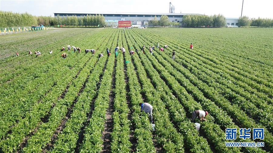 7月14日,在克東縣昌盛鄉(xiāng)青刀豆蔬菜種植示范基地,雇工在采摘青刀豆(無人機照片)。黑龍江省克東縣地處大興安嶺南麓,近年來,當(dāng)?shù)卮罅Πl(fā)展扶貧產(chǎn)業(yè),探索“小院經(jīng)濟”、訂單種植和加工產(chǎn)業(yè)相融合新方式,帶動農(nóng)民就業(yè)和脫貧增收。新華社記者 王建威 攝