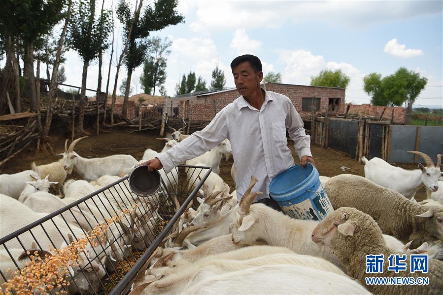 7月14日,高二仁在羊圈里給羊喂飼料。