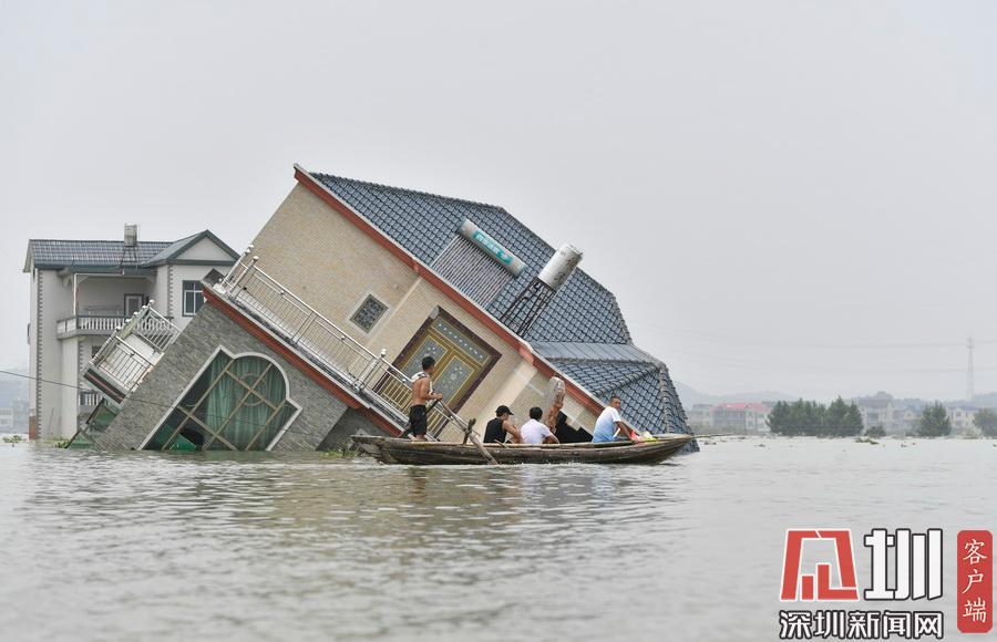 2020年7月15日,江西省鄱陽縣油墩街鎮(zhèn)同興村,村莊受到洪水圍困,大部分村民已經(jīng)被轉(zhuǎn)移出去,仍有少數(shù)村民選擇留守家中積極自救繼續(xù)生活。7月8日晚,鄱陽縣油墩街鎮(zhèn)西江因特大暴雨出現(xiàn)漫堤決口,5個(gè)行政村被洪水圍困,數(shù)萬名群眾被及時(shí)疏散轉(zhuǎn)移。同興村村民張瑤康回憶起了當(dāng)時(shí)的場景,“水一下子就涌進(jìn)來,等緩過神來趕緊向二樓轉(zhuǎn)移一樓的物品。洪水來時(shí)只從一樓搶到了一些輕便易拿的東西,冰箱、洗衣機(jī)之類的大物件,至今仍浸泡在一樓水中?!?5日,記者跟隨張瑤康乘船回家,抵達(dá)后看到,一樓淹沒在水中,一個(gè)綁在二樓護(hù)欄的木梯成為進(jìn)出“家門”的唯一通道?!懊刻靹澊ゴ謇镞\(yùn)送水和食物,家里有煤氣罐和灶臺(tái)。因?yàn)?0多歲的老母親行動(dòng)不便,我們選擇留守家中?!薄半m然對(duì)岸就有安置點(diǎn),但還是更愿待在自己家里,一來是不愿意給政府添麻煩,二來能每天看著自己的房子心里踏實(shí)?!蓖d村村民張長來夫婦帶著剛剛領(lǐng)到的大米、方便面、飲用水乘船回到家中。記者在現(xiàn)場看到,隨著各方救援力量和物資的匯聚,被洪水圍困的村民生活雖有不便,但生活仍在繼續(xù)?!胺孔硬坏?,家就在,我們要積極面對(duì),早日重建家園?!睆埇幙蹈嬖V記者。
