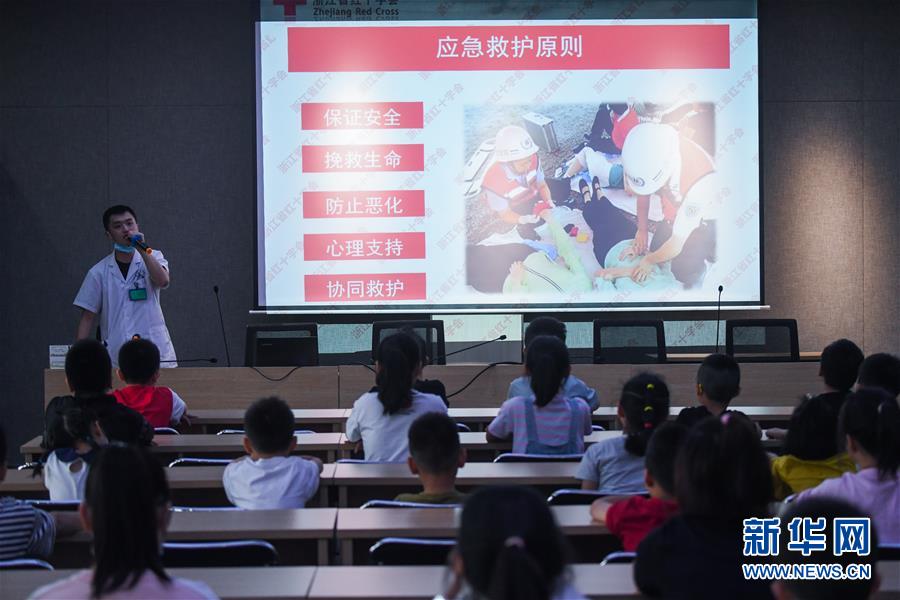 7月16日,東林鎮(zhèn)衛(wèi)生院的醫(yī)護(hù)人員(左一)在給學(xué)生們上應(yīng)急救護(hù)課。當(dāng)日,浙江省湖州市吳興區(qū)東林鎮(zhèn)舉辦暑期“安全防護(hù)小超人”主題活動(dòng)?;顒?dòng)由醫(yī)護(hù)人員、消防隊(duì)員等為學(xué)生及家長(zhǎng)講授日常安全避險(xiǎn)及溺水急救知識(shí),中小學(xué)們還在現(xiàn)場(chǎng)學(xué)習(xí)了簡(jiǎn)易包扎、心肺復(fù)蘇的正確方式,并了解滅火器、滅火毯等消防器材的使用,為學(xué)生平安過(guò)暑期打好安全防護(hù)“預(yù)防針”。新華社記者 徐昱 攝
