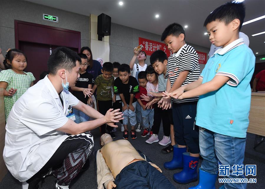 7月16日,東林鎮(zhèn)衛(wèi)生院的醫(yī)護人員(左一)在給學生們示范和講解心肺復(fù)蘇的操作知識。當日,浙江省湖州市吳興區(qū)東林鎮(zhèn)舉辦暑期“安全防護小超人”主題活動?;顒佑舍t(yī)護人員、消防隊員等為學生及家長講授日常安全避險及溺水急救知識,中小學們還在現(xiàn)場學習了簡易包扎、心肺復(fù)蘇的正確方式,并了解滅火器、滅火毯等消防器材的使用,為學生平安過暑期打好安全防護“預(yù)防針”。新華社記者 徐昱 攝