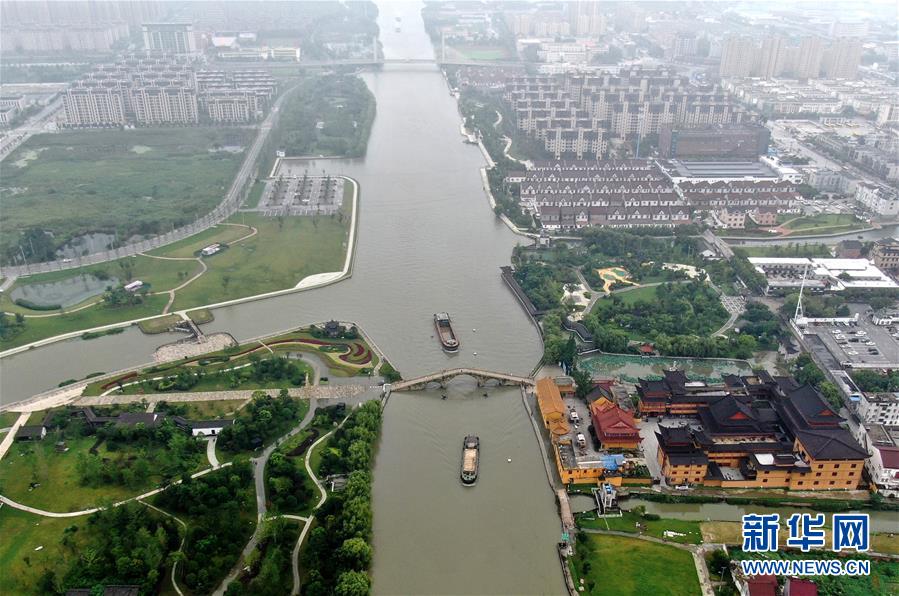 7月17日拍攝的秀洲區(qū)王江涇鎮(zhèn)長虹橋附近的河道(無人機(jī)照片)。浙江省嘉興市秀洲區(qū)處在杭嘉湖平原,受持續(xù)強(qiáng)降雨及上游排水影響,近期,秀洲區(qū)境內(nèi)的京杭大運(yùn)河分支航道持續(xù)保持較高水位。當(dāng)?shù)叵嚓P(guān)部門嚴(yán)陣以待,落實(shí)各項(xiàng)措施,確保安全度汛。新華社記者韓傳號(hào)攝