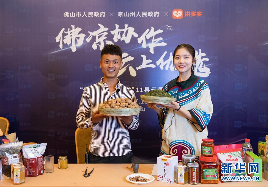 7月16日,直播主持人在電商直播間推介涼山農(nóng)特產(chǎn)品。新華社記者江宏景攝