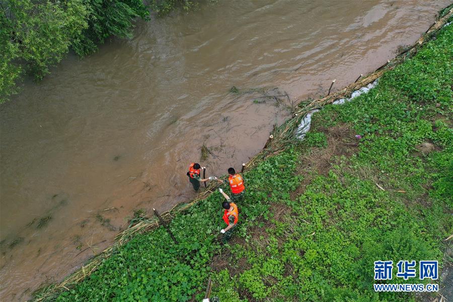 在鎮(zhèn)江市丹徒區(qū)世業(yè)鎮(zhèn)先鋒村西南大堤,中國安能集團(tuán)第二工程局常州分公司防汛前置備勤隊(duì)員在用木樁固定捆好的蘆葦(7月17日攝,無人機(jī)照片)。捆蘆葦護(hù)邊坡、機(jī)器人進(jìn)涵洞、“養(yǎng)水盆”防滲漏……在江蘇鎮(zhèn)江,當(dāng)?shù)馗刹咳罕姾蛯I(yè)力量,因地制宜就地取材,老辦法搭配新技術(shù),一批險情得以消除在萌芽狀態(tài)。新華社記者季春鵬攝