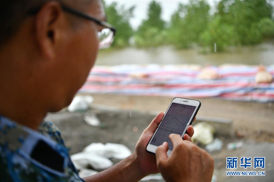 劉良武在手機(jī)上查詢水位情況(7月19日攝)。新華社記者李鑫攝