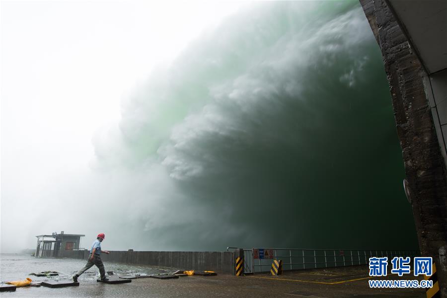 新安江電廠工作人員從正在泄洪的新安江水庫壩底經過(7月7日攝)。新華社記者翁忻旸攝
