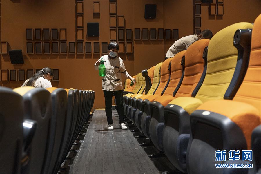 7月20日,一家影院的工作人員在觀眾散場后進行消殺工作。當日,在各項疫情防控措施有效落實到位的前提下,武漢市部分電影院恢復(fù)開放。新華社記者熊琦攝