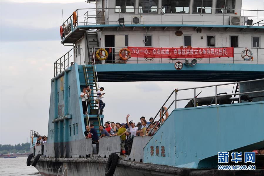 在江西省九江市柴桑區(qū)江新洲的渡口,部分居民登上渡輪撤離(7月12日攝)。新華社記者彭昭之?dāng)z