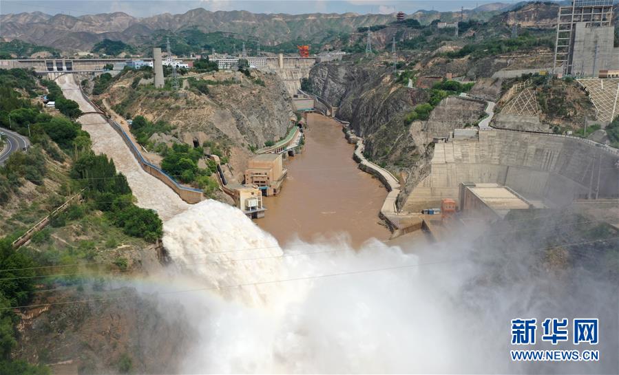 7月21日,劉家峽水庫(kù)正在泄洪(無(wú)人機(jī)照片)。新華社記者陳斌攝