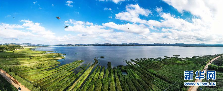 鳥兒在草海上空飛翔(無人機全景照片,6月9日攝)。新華社記者楊文斌攝